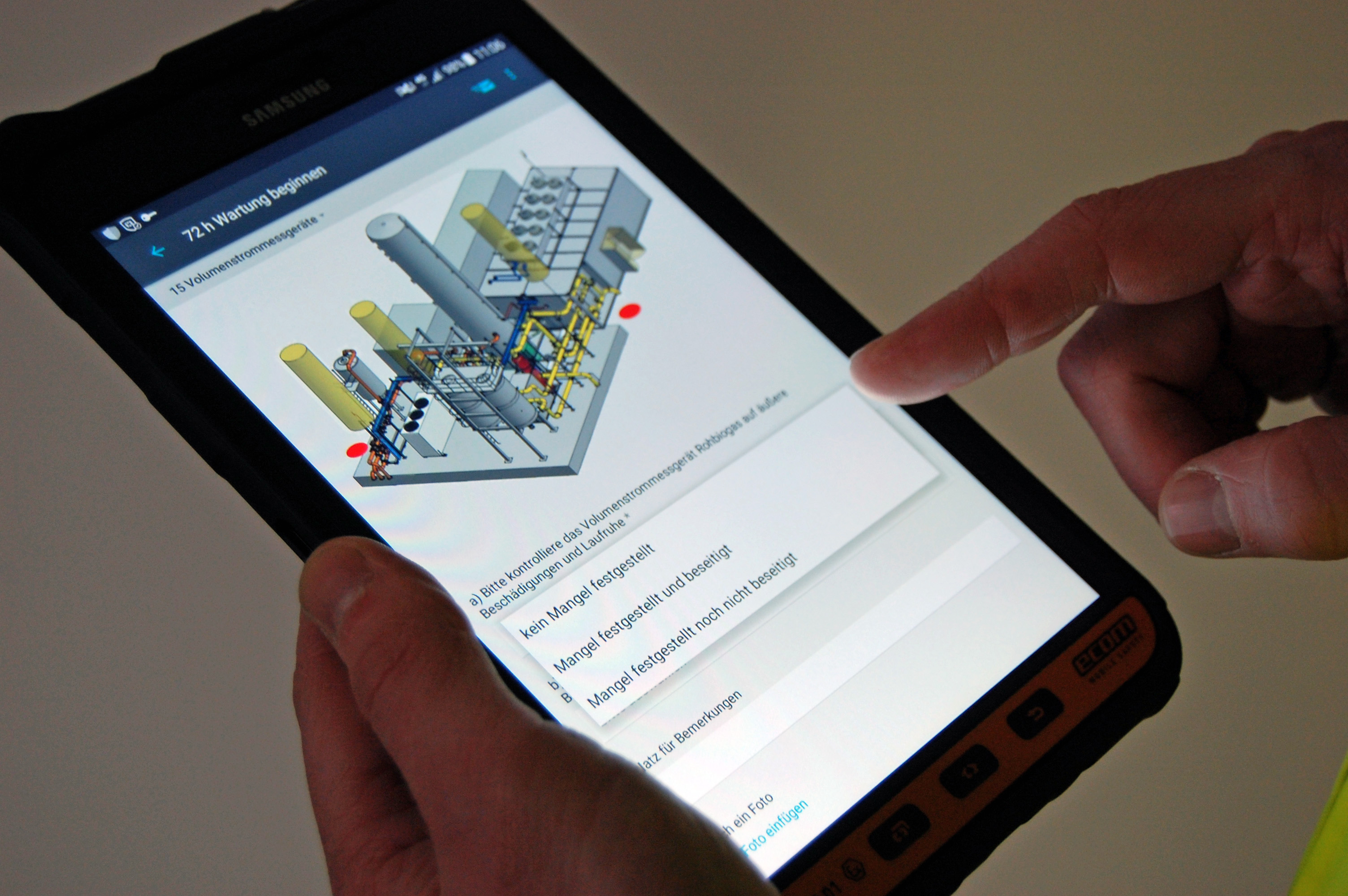 Statt der handschriftlichen Erfassung erfolgt die Protokollierung unkompliziert in einem Drop-down-Menü mit einer entsprechenden Vorauswahl. Diese kann durch eigene Anmerkungen ergänzt werden. Die integrierte Fotofunktion ermöglicht zusätzlich die visuelle Dokumentation von festgestellten Mängeln, benötigten Ersatzteilen, Komponentenspezifikationen oder Ähnlichem. Abschliessend wird die ordnungsgemässe Durchführung der Wartung bestätigt und auf dem Tablet oder dem Smartphone revisionssicher unterschrieben.