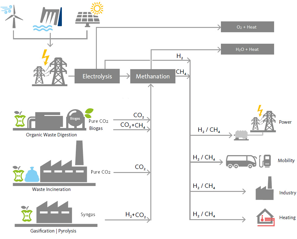 Im Power-to-Gas-Verfahren kommen Elektrolyse und Methanisierungsanlagen zum Einsatz. Bei der Elektrolyse wird in einem ersten Schritt Wasser (H2O) mit Hilfe von Elektrizität in Wasserstoff (H2) und Sauerstoff (O2) getrennt. Der erzeugte Wasserstoff kann direkt genutzt oder für weitere Prozesse verwendet werden. Bei der Methanisierung wird Wasserstoff zusammen mit Kohlendioxid (CO2) durch eine Reaktion zu synthetischem Methan (CH4) und Wasser umgewandelt. Der Wasserstoff kann direkt aus Elektrolyseanlagen sowie aus Synthesegas stammen, das thermochemisch aus Biomasse oder Abfall hergestellt wird.