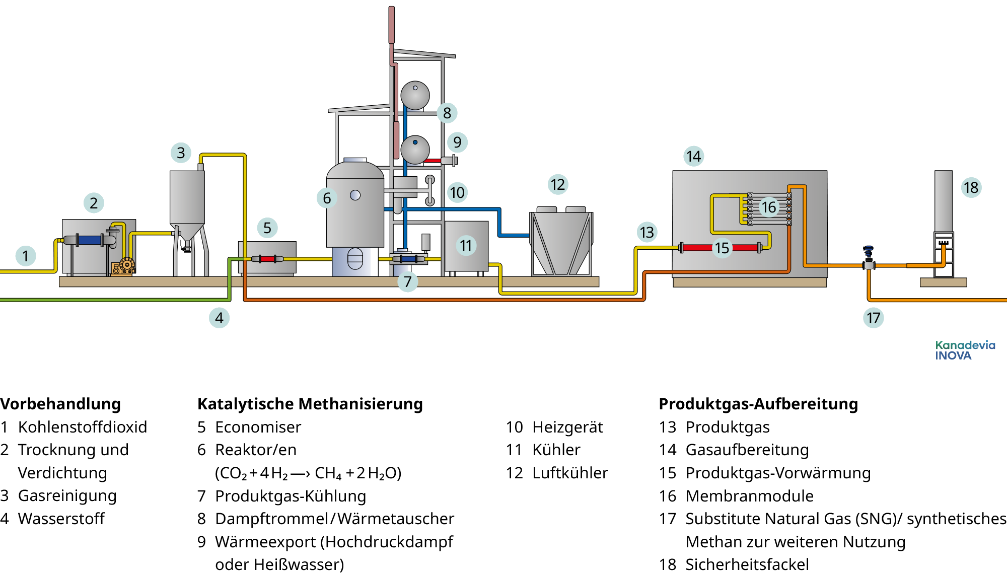 Das nach der Methanisierung entstandene CH4-reiche Produktgas bzw. Substitute Natural Gas (SNG) kann direkt genutzt, in bestehenden Gasinfrastrukturen gespeichert oder über zusätzliche Anlagen verflüssigt werden.