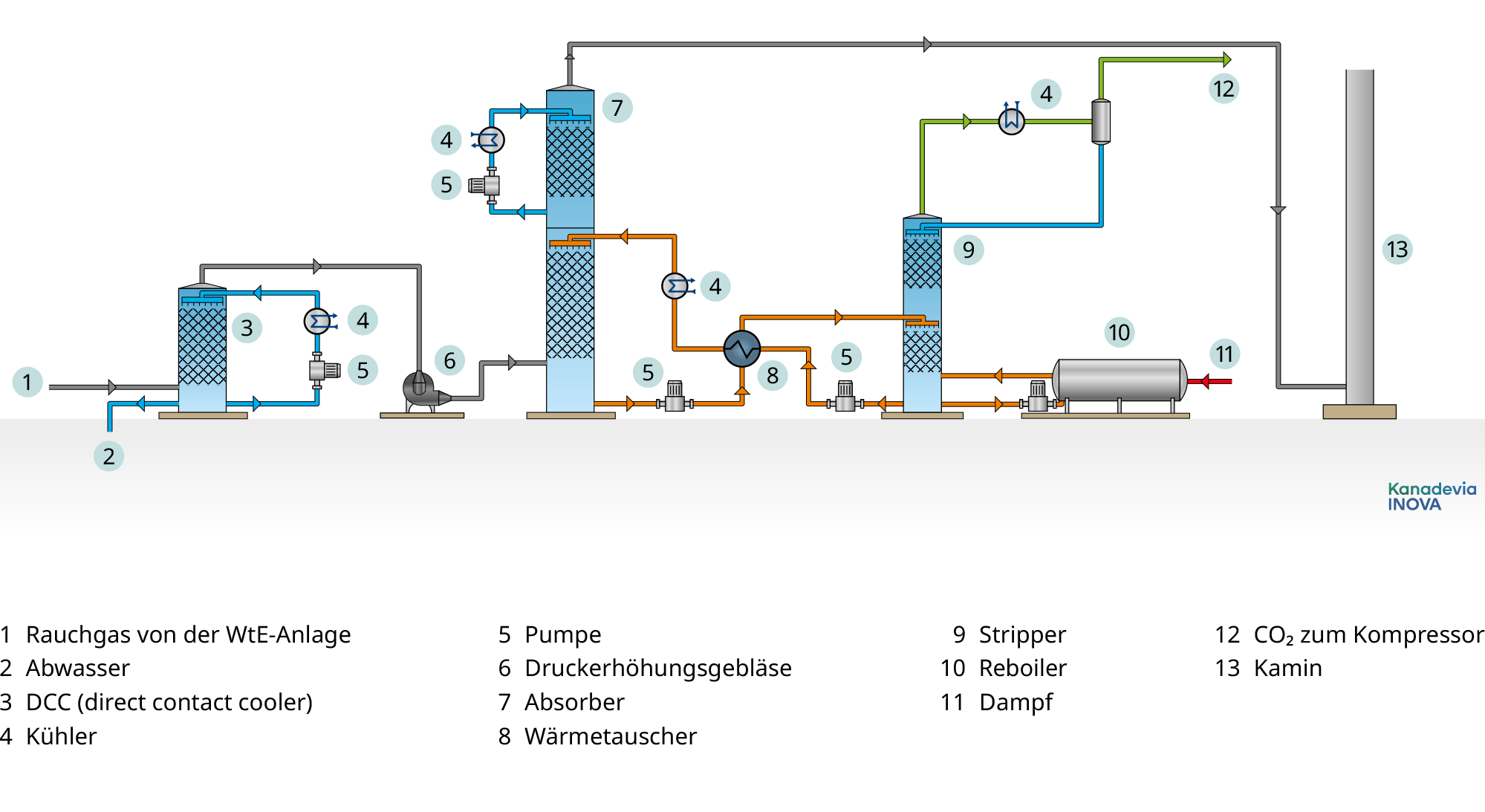 Kanadevia Inova entwickelt und stellt Technologien zur CO2-Abscheidung bereit, im Speziellen die Aminwäsche. Die Aminwäsche ist ideal, um die CO2-Konzentrationen im Abgas zu reduzieren und gleichzeitig hochwertiges CO2 zu produzieren.