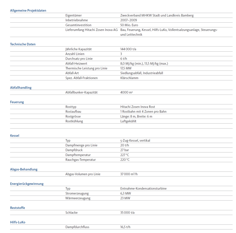 Die WtE-Anlage Bamberg sorgt mit ihren drei Verfahrenslinien für die sichere Verwertung der Restabfälle der fränkischen Städte und Landkreise Bamberg, Forchheim, Erlangen und Erlangen-Höchstadt. Mit einer Kapazität von bis zu 6,6 t/h pro Linie werden jährlich rund 144000 Tonnen Siedlungs-und Industrieabfälle, Sperrmüll sowie entwässerter Klärschlamm ökologisch und wirtschaftlich verarbeitet. Der Klärschlamm, rund 126000 m3/a mit 3% Feststoffgehalt (nach der Entwässerung rund 30% Feststoffgehalt), wird in den Abfall-Bunker gestreut, mit dem übrigen Abfall vermischt und thermisch behandelt. Mit den erklärten Zielen, die Kapazität der Anlage den heutigen Anforderungen anzupassen sowie die Energierückgewinnung zu optimieren, beauftragte der Zweckverband, der die Waste-to-Energy-Anlage Bamberg betreibt, Kanadevia Inova mit der kompletten Modernisierung der drei Feuerungslinien. Das Projekt umfasste auch die Schnittstellen zu den bestehenden Teilsystemen zur Abgas-Behandlung und Energierückgewinnung. Eine der wichtigsten Anforderungen des Zweckverbandes an Kanadevia Inova war die Sicherstellung des kontinuierlichen Betriebs von zwei Anlagenlinien und damit die jederzeit sichere unterbrechungsfreie Abfall-Verwertung. Der Umbau erfolgte in drei Etappen, jeweils in den Sommermonaten 2007 bis 2009. Zum Auftrag gehörten der Abbau der alten Linien, die Installation der neuen Feuerung sowie die Inbetriebnahme der jeweiligen Linie. Der enge Terminplan des klar definierten Projekts stellte hohe Anforderungen an Kanadevia Inova hinsichtlich Logistik, Organisation und Teamarbeit. Nach dem reibungslosen Ablauf der Modernisierung liefert die Anlage heute 23 MW thermische Energie, die über das eigene Fernwärmenetz die Heizsysteme von 64 Kunden an insgesamt 83 Verteilerstellen mit Wärme versorgt. Zudem erzeugt sie rund 6,3 MW elektrische Energie, die zur Deckung des Eigenbedarfs der Anlage verwendet werden; der Überschuss wird in das städtische Versorgungsnetz eingespeist. Eine