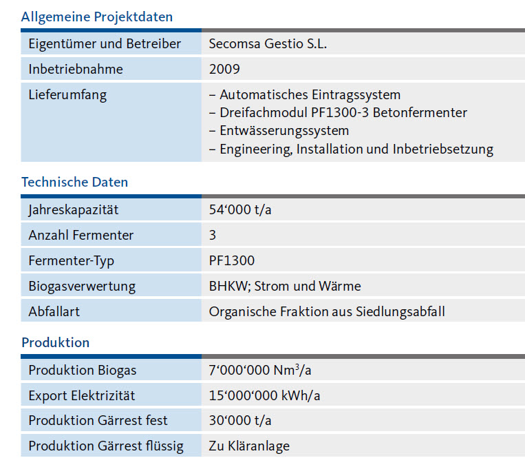 Wärme produzieren. Die Wärme wird zur Beheizung der Fermenter genutzt, während der Ökostrom in das öffentliche Netz eingespeist wird. Der Gärrest wird am anderen Ende der Fermenter mit Kolbenpumpen abgepumpt und dem Entwässerungssystem zugeführt. Hier erfolgt mittels Schneckenpressen die Separation in eine flüssige und eine feste Fraktion. Der feste Gärrest wird in einem Kompostierwerk mit geschlossenen Tunnels und offenen Mieten weiterveredelt und anschliessend als biologisches Abdeckmaterial im Strassenbau und auf Golfplätzen verwendet. Die flüssige Fraktion dient zu einem Teil der Befeuchtung des frischen Substrats – das überschüssige Presswasser wird in der betriebseigenen Kläranlage gereinigt und schliesslich sauber zurück in die Umwelt gegeben.