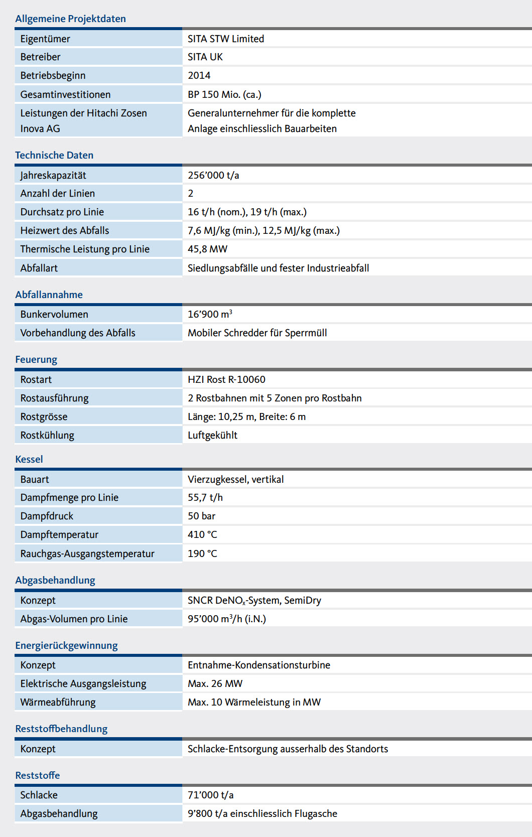 Die autarke neue WtE-Anlage wird in Teesside in der Nähe von drei bereits von SITA UK betriebenen WtE-Anlagen errichtet. Die dritte Linie der vorhandenen Anlage wurde von Kanadevia Inova erfolgreich fristgemäss 2009 an SITA Northumberland Ltd. im Rahmen eines PFI-Vertrages übergeben. Die vorhandene WtE-Anlage in Teesside liefert etwa 30 MW Strom, die aus Abfall, das heisst aus einer erneuerbaren Energiequelle, gewonnen werden. Die neue Anlage erhöht die Produktionskapazität um 22 MW Strom und sieht auch vor, neben Elektroenergie Fernwärme an die benachbarten Industriebetriebe abzugeben. Die in das öffentliche Netz eingespeiste zusätzliche Strom entspricht dem Energiebedarf von etwa 30’000 Haushalten.