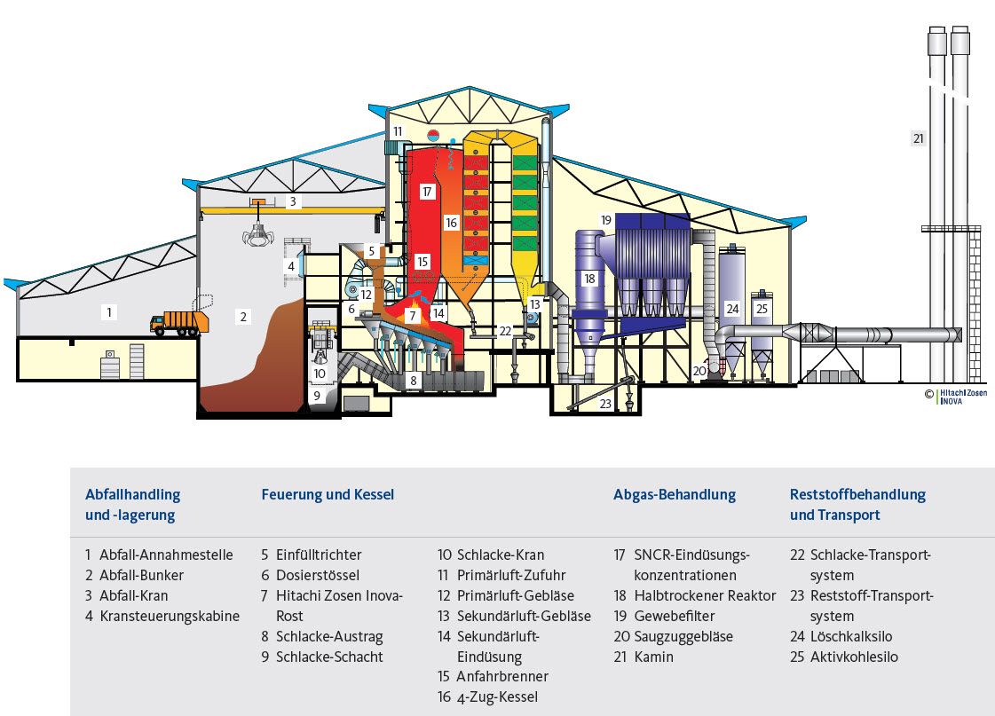 Der Kessel wurde so konstruiert, dass er in das vorhandene Gebäude passt. Der Abfall gelangt dann durch den Einfülltrichterschacht auf einen Inova Rost mit zwei Bahnen. Der bewegliche Rost erlaubt eine optimale Verbrennung der unterschiedlichen Abfall-Fraktionen. Ausserdem ist durch die vollintegrierte Verbrennungsregelung eine schnelle Anpassung der Verbrennungsbedingungen im Interesse eines möglichst sicheren und effizienten Betriebs möglich. Im ersten Kesselzug erfolgt die Reduktion der Stickoxide mit dem selektiven, nicht-katalytischen Reduktionssystem (SNCR-System), bei dem Ammoniaklösung als Reduktionsmittel eingedüst wird. Das Verfahren reduziert das Volumen des angelieferten Abfalls um