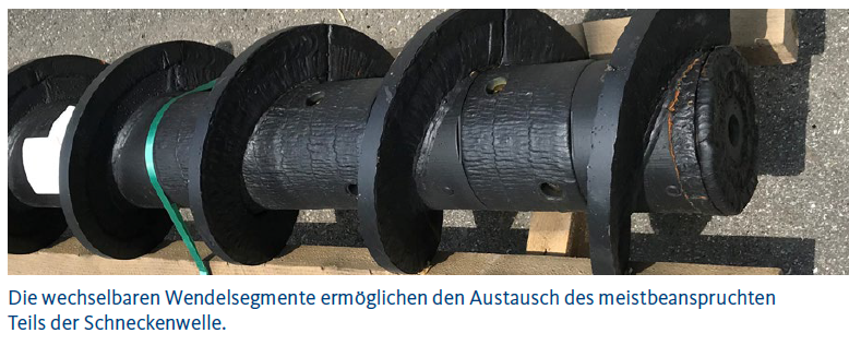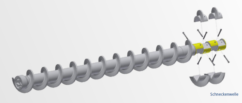 Die wechselbaren Wendelsegmente der Schneckenwelle können von einer einzelnen Person mit wenigen Handgriffen ausgetauscht werden. So wird zeitaufwändiger und kostenintensiver Unterhalt vermieden. Bewährt im Betrieb seit 2021.
