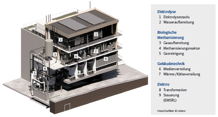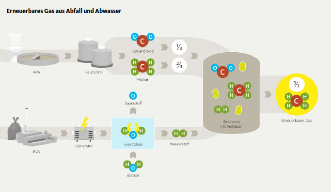 Hierfür wurden bestehende Verwertungs- bzw. Aufbereitungsverfahren effizient miteinander verbunden. Die KVA verwertet jährlich über 95’000 Tonnen Haushalts- und Industrieabfälle und erzeugt dabei regenerative elektrische Energie. Statt diese ins öffentliche Netz einzuspeisen, setzt man sie in der Elektrolyse der Power-to-Gas-Anlage ein, um Trinkwasser aus der Wasseraufbereitung in Wasserstoff (H2) und Sauerstoff (O2) zu spalten. Dieser Wasserstoff findet in der biologischen Methanisierung Verwendung. Mikroorganismen wandeln ihn durch Zufuhr von CO₂-haltigem biogenem Gas aus der Abwasseraufbereitung in Methan um. In den Faultürmen der ARA bauen anaerobe Mikroorganismen den Klärschlamm zunächst zu Biogas ab, welches zu etwa zwei Dritteln aus Methan und einem Drittel Kohlendioxid besteht. Es wird verdichtet und in den Bioreaktor geleitet, der zu drei Fünfteln mit ausgefaultem Klärschlamm aus der