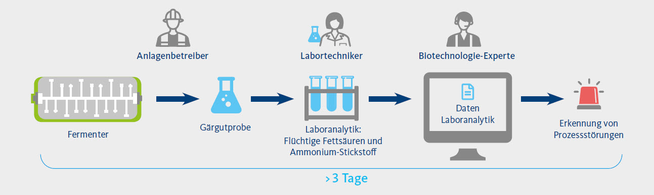 Zu spät erkannte Störungen der Prozessbiologie im Fermenter führen zu einer verminderten Nutzung der Anlagenkapazität sowie geringerer Gasproduktion und damit zu finanziellen Verlusten. Die am weitesten verbreitete Methode zur Prozessüber-wachung besteht aus Laboranalysen zur Messung der flüchtigen Fettsäuren und Ammonium-Stickstoffe im Gärgut, welche dann erst von einem Prozessexperten analysiert werden müssen.