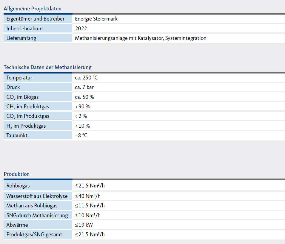 Bei der Anlage in Gabersdorf handelt es sich um ein Pionierprojekt, denn dort wird Rohgas für die katalytische Methanisierung eingesetzt, in dieser Grössenordnung eine Weltneuheit. Das maximiert zum einen den Methangewinn aus der Biogaserzeugung und zeigt zum anderen eine neue Option bei der Methanisierung, die konventionell mit reinem CO₂ und Wasserstoff erfolgt. Das Kernstück der von Kanadevia Inova entwickelten und errichteten Methanisierungseinheit bildet eine Reaktoreinheit mit einem Katalysator, der sich durch eine hohe Konversionsrate auszeichnet. Die spezielle Konstruktion des Reaktors erlaubt eine gute Temperaturkontrolle, was einen langlebigen Betrieb des Katalysators ermöglicht. Durch die Auskopplung von Hochdruckdampf kann ein hoher Gesamtwirkungsgrad erzielt werden.