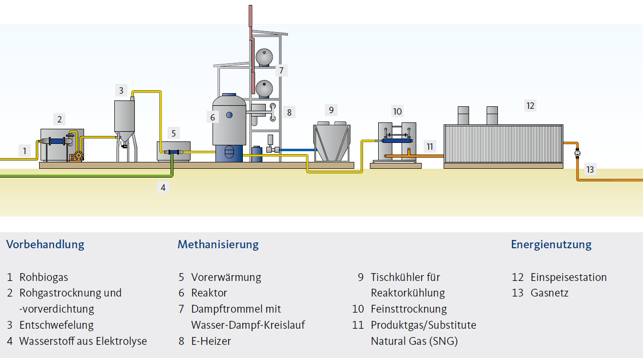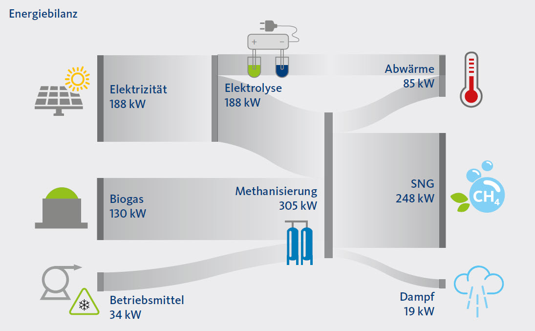 Meist wird dies mittels Gasaufbereitung vom Methan abgetrennt und so Biomethan erzeugt. Bei diesem Projekt hingegen wird das CO₂ nicht abgespalten, sondern es reagiert in der Methanisierungseinheit mit dem grünen Wasserstoff zu synthetischem Methan (SNG; engl.: synthetic/substitute natural gas). Es wird regelwerkskonform ins Gasnetz eingespeist und ersetzt fossiles Erdgas.