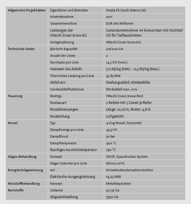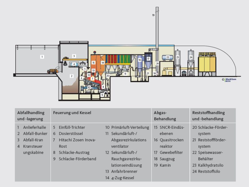 Die Anlage verfügt über zwei identische Prozesslinien mit neuester Technologie, die jeweils Verbrennungssystem, Kessel und Abgas-Behandlung umfassen. Sie erfüllt die Anforderungen der EU-Abfall-Verbrennungsrichtlinie in vollem Umfang.