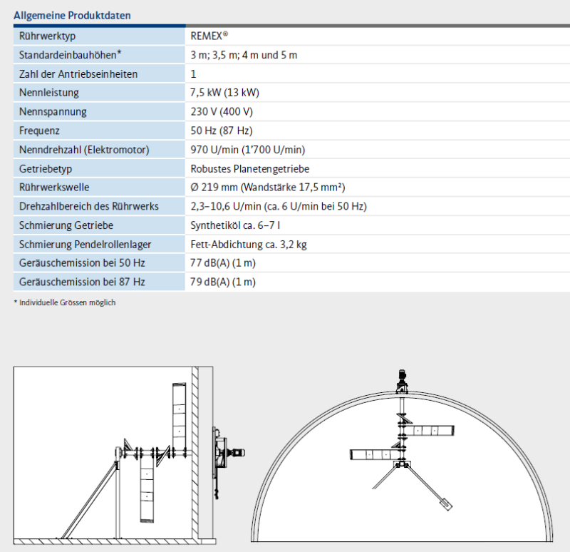 Im Zentrum jeder Biogasanlage steht der Fermenter mit einem leistungsstarken und robusten Rührwerk. Das kontinuierlich laufende Rührwerk REMEX® durchmischt Substrate im Fermenter oder im Nachgärer der Biogasanlage gleichmässig und unter Schonung der Prozessbiologie.