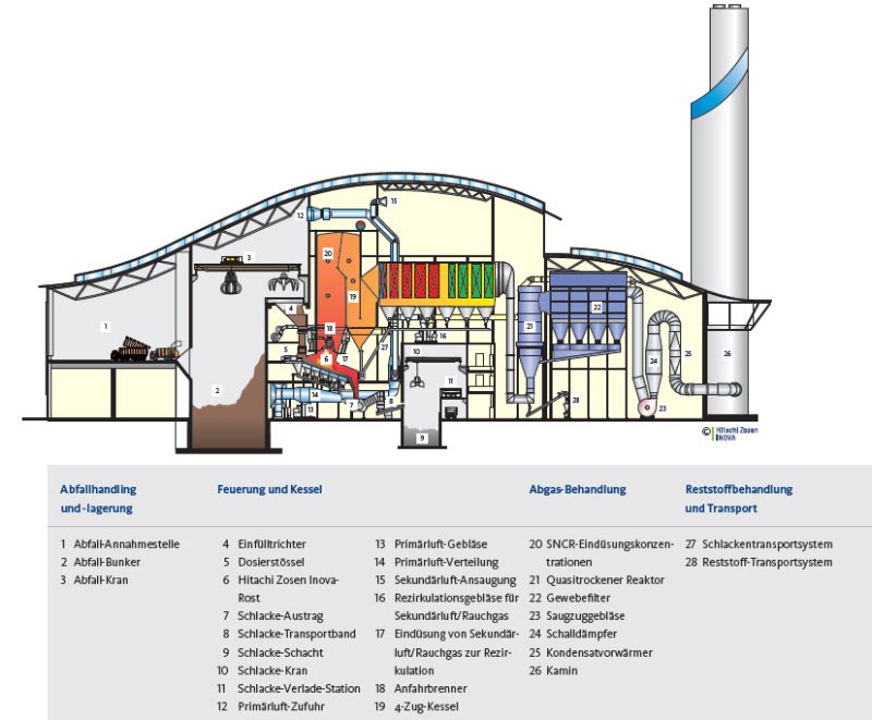 Energie wie möglich abgegeben hat, hat es immer noch eine ausreichend hohe Temperatur zur effizienten und zuverlässigen Entfernung von Verunreinigungen. Die Reinigung erfolgt in dem quasitrockenen System durch einen Reaktor und einen Gewebefilter. Das bewährte quasitrockene Verfahren gewährleistet, dass die thermische Abfall-Verwertungsanlage die Emissionsgrenzwerte der Europäischen Union mit Sicherheit einhält und sogar unterschreitet. Als Reagenzien zur Entfernung gasförmiger Schadstoffe werden Löschkalk und Aktivkohle eingesetzt, damit werden auch Schwermetalle und Dioxine entfernt. Alle Partikel werden im Gewebefilter zurückgehalten. Die Waste-to-Energy-Anlage kann auch mit Natriumbikarbonat als Reagenz arbeiten, wenn dies in Zukunft zweckmässig sein sollte.