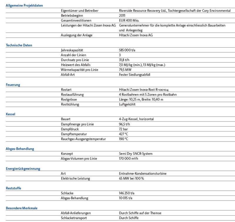 Wie das Referenzprojekt von Kanadevia Inova in Paris, die Waste-to-Energy-Anlage Isséane, ist auch die thermische Abfall-Verwertungsanlage Riverside ein Beispiel für ein Energierückgewinnungskonzept in einer der grössten Hauptstädte Europas. Beide Projekte belegen, wie sorgfältig heute ganzheitliche und umweltfreundliche Konzepte berücksichtigt werden. Es geht nicht nur um Betriebssicherheit, sondern auch um die Gewissheit, dass die gesetzlichen Emissionsgrenzen eingehalten werden. Das besondere Augenmerk jedoch liegt auf der Energierückgewinnung. Die Waste-to-Energy-Anlage Riverside ist die einzige thermische Abfall-Verwertungsanlage Europas, die bei der Elektroenergieerzeugung einen Nettowirkungsgrad von 27 % erreicht. Die Anlage soll diese Grenze durch mehrere Rückgewinnungsverfahren sowie optimale Dampfparameter erreichen. Da die Waste-to-Energy-Anlage sich ausserdem in einem Erschliessungsgebiet befindet, wurde der Wasserdampfkreislauf der thermischen Abfall- Verwertungsanlage so ausgelegt, dass in Zukunft ein Anschluss an das Fernwärmenetz möglich ist. Die Erfahrung von Kanadevia Inova mit solchen
