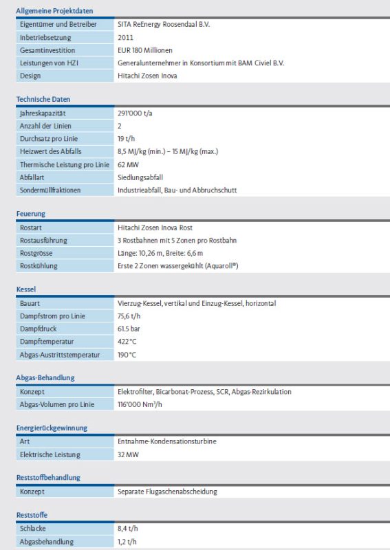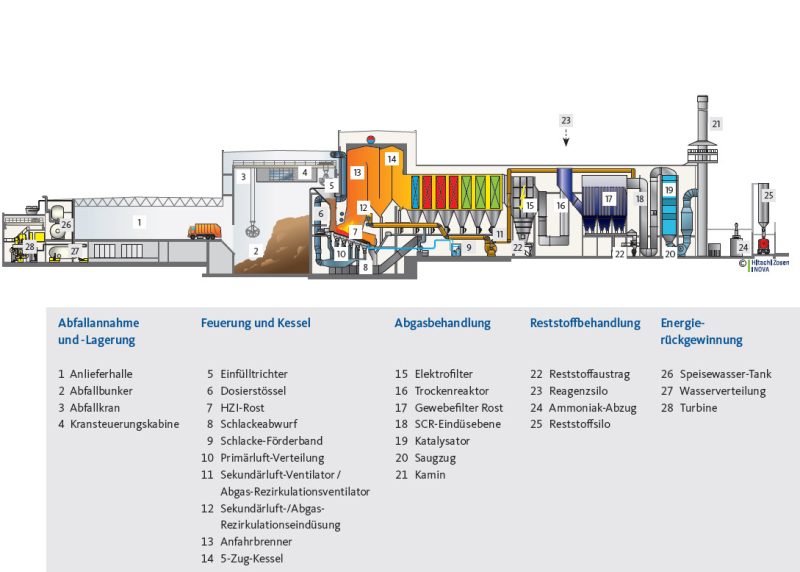 wird verdampft und auf 62 bar und 422 °C überhitzt. Die Energie aus dem überhitzten Dampf wird über eine Dampfturbine mit einem Generator in Elektrizität umgewandelt. Der Abdampf der Turbine wird kondensiert und als Wasser in die Kessel zurückgeführt. Aus dem ursprünglichen Energieinhalt des Abfalls werden ca. 28 % als Elektrizität rückgewonnen.