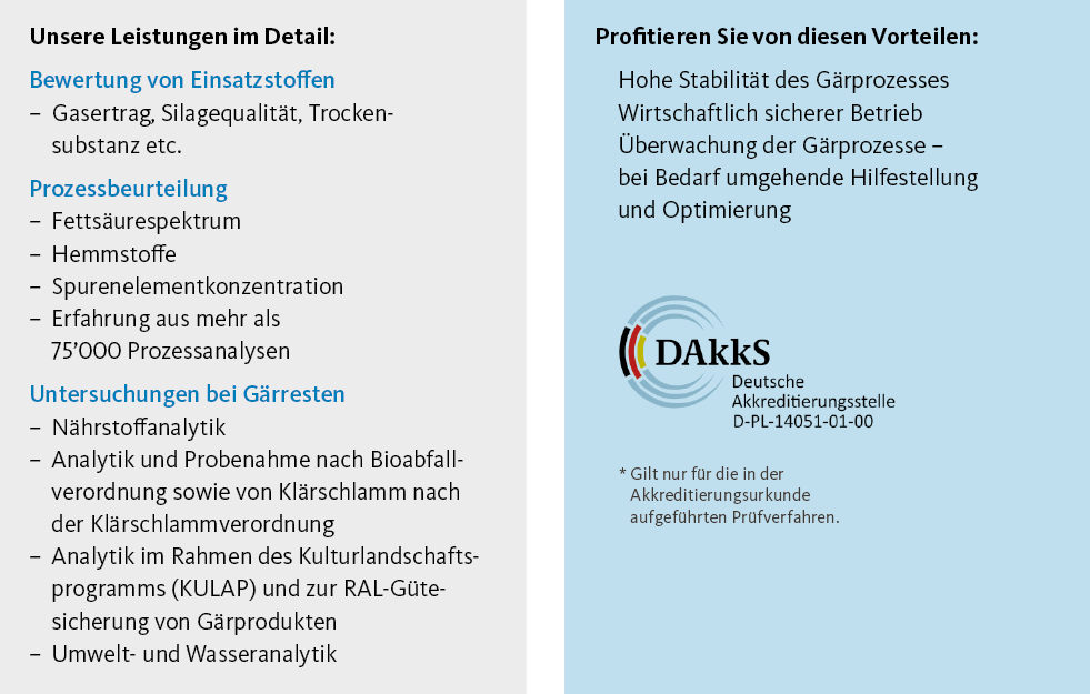 Zu diesem Zweck bietet unser hauseigenes akkreditiertes* Labor eine umfassende Analytik für Biogasanlagen an: von der Bewertung unterschiedlicher Einsatzstoffe über die Gärprozesskontrolle bis hin zur Beurteilung des Gärrestes.