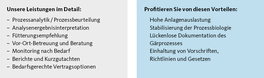 Mit unseren modernen Analysegeräten und Methoden liefern wir Ihnen zuverlässig und zeitnah die Ergebnisse über den aktuellen Gärprozess und alle wichtigen Prozessgrössen. Aus diesen Daten erhalten Sie von unseren Spezialisten Empfehlungen zur Verbesserung der Prozesse. Gemeinsam sorgen wir für einen stabilen und wirtschaftlichen Anlagenbetrieb.