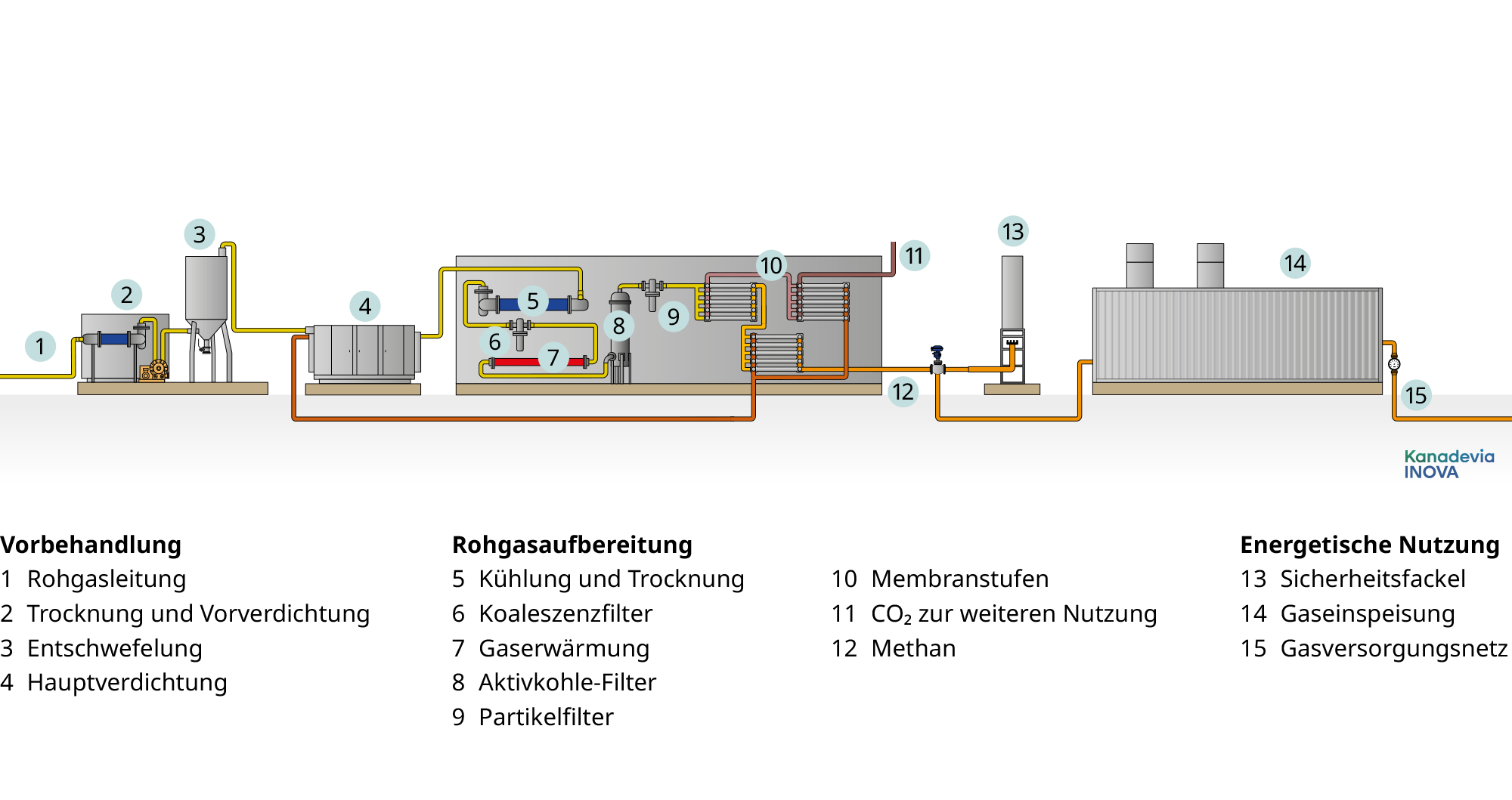 Für die zuverlässige Aufbereitung des Rohgases erfolgt zunächst eine Entfeuchtung/Trocknung, Vorverdichtung und Vorreinigung: Schwefelwasserstoff sowie andere unerwünschte Begleitstoffe werden dabei in einem Filtersystem mit speziell beschichteter Aktivkohle aus dem Rohgasstrom entfernt.