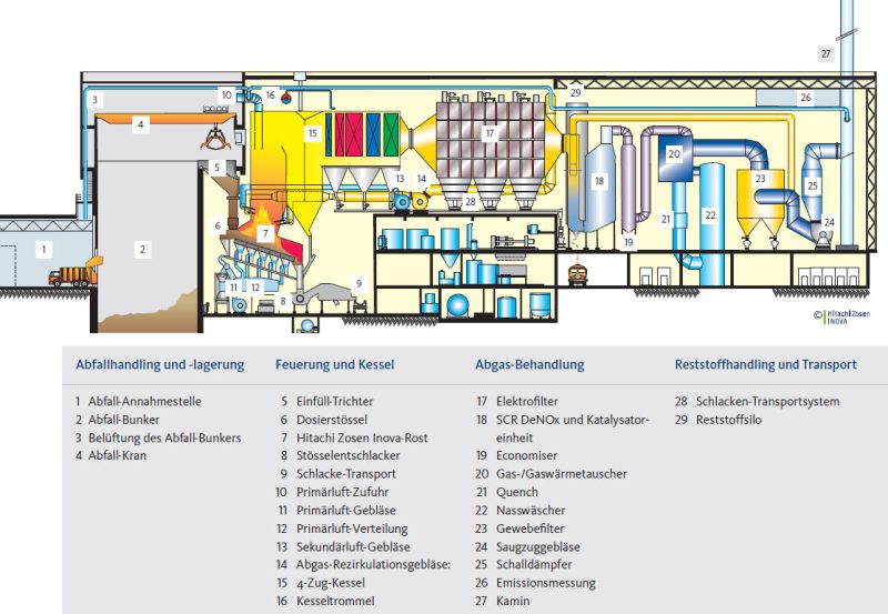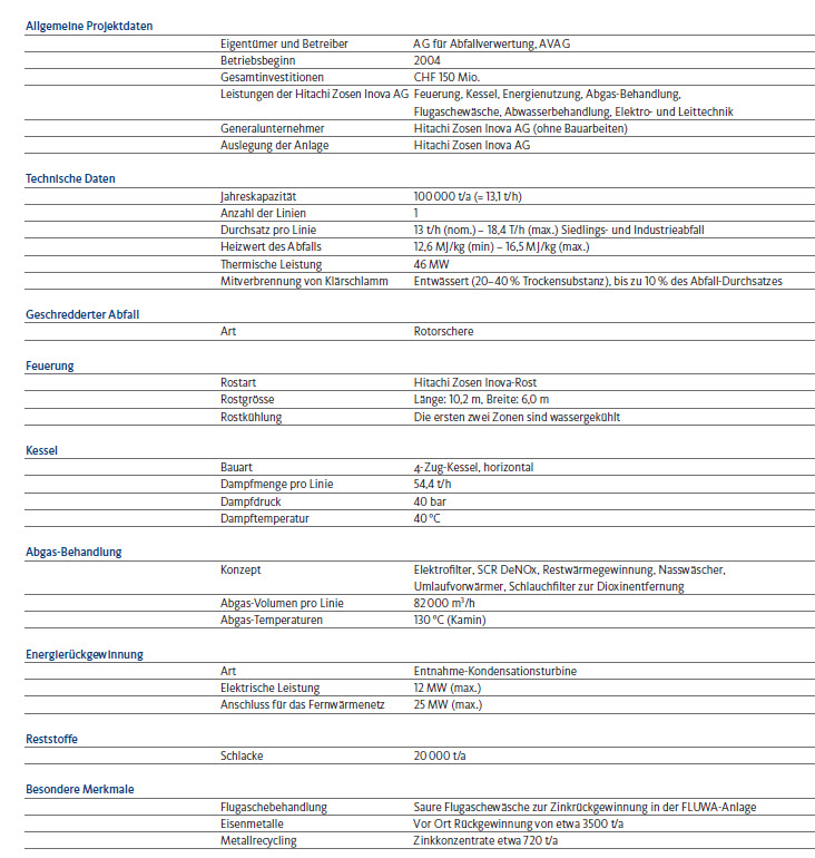 Wichtig sind die zuverlässige Entfernung von Verunreinigungen sowie geringe Emissionen. Das effiziente Überwachungssystem der Luftschadstoffe in der Waste-to-Energy-Anlage sorgt nicht nur dafür, dass diese Forderungen erfüllt werden, sondern auch die (strengeren) Luftreinhaltevorschriften der Schweiz werden deutlich unterschritten. Die Abgas-Behandlung besteht aus folgenden Stufen: Elektrofilter, SCR-DeNOx-System (selektive, katalytische Reduktion), Abwärmerückgewinnung, Nasswäsche und Gewebefilter. Die meisten Partikel und die daran gebundenen Schwermetalle werden in dem Elektrofilter aus dem Abgas abgeschieden. In der nachgeschalteten SCR-Einheit erfolgt durch den Katalysator die Aufspaltung der Stickoxide in Sickstoff und Wasser, beides natürliche Bestandteile der Luft. Die Abgase mit einer Temperatur von jetzt etwa 260 °C werden dann in einem Economiser auf etwa 170 °C heruntergekühlt; die sauren Gase, beispielsweise Schwefeldioxid und Chlorwasserstoff, werden dann in dem Nasswäscher ausgewaschen. Nach der Vorwärmung im Gas-/Gaswärmetauscher werden Feinstäube, Dioxine und restliche Schwermetalle im Gewebefilter zurückgehalten. Ein Saugdruckgebläse bläst dann die sauberen Abgase in den 70 m hohen Schornstein. Bevor das Abgas die Waste-to-Energy-Anlage verlässt, prüft ein Messsystem laufend die Einhaltung der strengen Emissionsanforderungen.