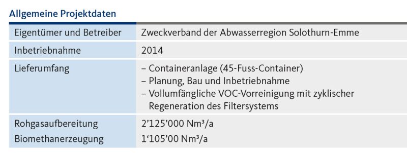von Bioerdgas zu. Mittels membranbasierter Gaspermeation scheidet die Aufbereitungsanlage das Kohlendioxid vom Methan ab und veredelt letzteres auf Erdgasqualität. Das so erzeugte Biomethan wird ins Netz der Regio Energie Solothurn eingespeist. Zudem verringert sich die zu entsorgende Klärschlamm-Menge durch den biologischen Abbau um zirka 40 %.