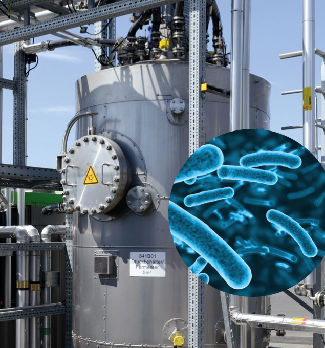 Our BiON® biological methanation technology uses special microorganisms to metabolise hydrogen and carbon dioxide into methane. This anaerobic process can be operated very dynamically and is highly robust when it comes to handling impurities in the raw gas. The system retains its dynamics in on-off mode: a rapid restart is easy after a shutdown. With our biological expertise we’re able to use anaerobic substrates to create process conditions under which the microorganisms can achieve optimum performance without the need for high levels of additives or complex dosing technology. Modelled on nature, the process works best at moderate temperatures of 65°C and can withstand pressures of 5 to 10 bar without any problems.