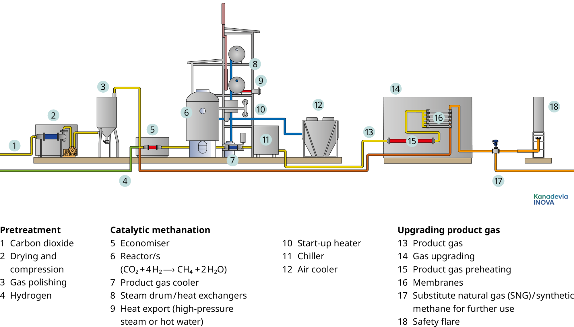 The CH4-rich product gas or substitute natural gas (SNG) resulting from methanation can be used immediately, stored in existing gas infrastructures or liquefied by additional systems.