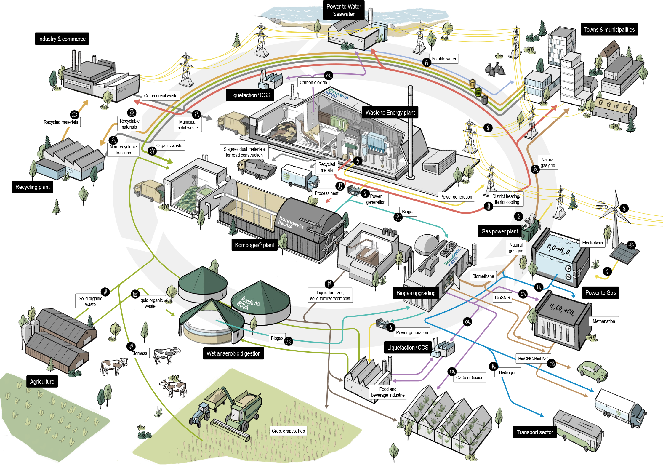 The focus is on recovering the useful materials contained in waste, disposing of non-recyclable waste hygienically and safely, and generating renewable energy on a constant basis. Thanks to state-of-the-art technologies, this concept closes gaps in the current circular economy approaches. The goal is to reduce the use of raw materials and fossil fuels to a minimum, or even to zero. In a system taking in all the relevant components, CO2 is separated out of processes wherever possible and used as a resource, or removed from the cycle by means of carbon capture and storage (CCS) approaches.