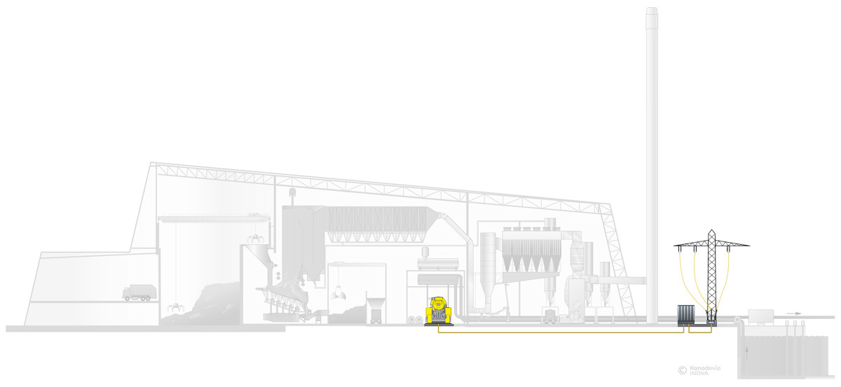 The power plant concept is proven, reliable and easy to operate. Superheated steam from the waste treatment plant drives a steam turbine connected to a generator. A small portion of the electric power produced by the generator is used for the plant itself, allowing it to run self-sufficiently. The rest can either be fed into a public grid or used by other industrial facilities on site, for example power-to-gas (gas upgrading), power-to-water (desalination) or other applications. The overall net efficiency of a plant producing only electric power is around 35%.