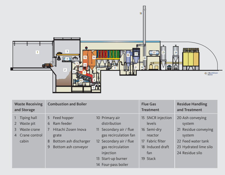The plant has two identical process lines with state of the art technology, each one consisting of combustion system, boiler and flue gas treatment. It fully complies with the EU Waste Incineration Directive.
